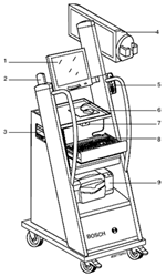 FSA 740 в базовом исполнении (рис. 15.32) состоит из передвижной тележки с персональным компьютером, принтером, клавиатурой, мышью, измерительным модулем и дистанционным управлением. Кроме того, имеется возможность для расширения функций при установке на тележке газоанализатора BEA 050 (для бензиновых двигателей) и дымомера RTM 430 (для дизельных двигателей).