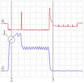 В момент прихода запорной иглы в верхнюю точку на графике тока виден характерный «провал» (поз. 1, рис. 15.44).