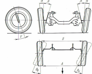 Для того чтобы уменьшить сопротивление движению, а значит и расход топлива, снизить изнашивание шин и подвески, путем снижения действующих на них динамических нагрузок, управляемые колеса должны катиться в вертикальных плоскостях, параллельных продольной оси автомобиля. Важным фактором повышения устойчивости автомобиля является стабилизация управляемых колес, т. е. стремление их вернуться после поворота в положение, соответствующее прямолинейному движению автомобиля. С учетом перечисленных факторов колеса автомобилей устанавливаются с углами схождения, развала, продольного и поперечного наклона оси, с разностью внутреннего и наружного углов поворота управляемых колес.
