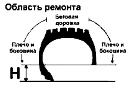 Шину обследуют на возможные скрытые повреждения и проверяют на целесообразность ремонта, учитывая условия эксплуатации и размер неремонтируемой зоны. Измерение неремонтируемой зоны производится от края борта вниз по внутренней стороне покрышки. Шина, имеющая повреждения корда в маркированной зоне борта Н (рис. 20.45) не подлежат ремонту. Размеры неремонтируемой зоны приведены в специальных условиях на тип данных шин.