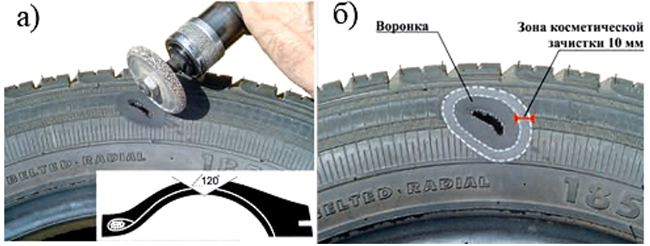Для наложения пластыря вырезают поврежденный участок резины с наружной стороны шины в виде воронки. Производят шероховку наружной поверхности шины, используя дисковую карбидную фрезу. Зачистку места ремонта нужно делать под углом не менее 120° в боковой зоне шины (рис. 20.46, а) и 90° на беговой дорожке. Для предварительной грубой обработки резины следует применять низкооборотистую шлифмашинку 2500 об/мин. С наружной стороны шины рваные края повреждения срезают в виде воронки, полностью удаляя разлохмаченные нити текстильного корда, для ускорения этой операции используют колпачковый резец.