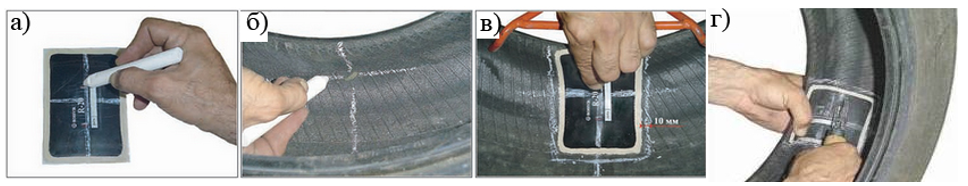 Небольшие повреждения (размером до 30 мм) ремонтируют наложением заплат из невулканизированной резины, а большие — заплатами из вулканизированной резины. Подлежащее ремонту место маркируют направляющими линиями в радиальном и осевом направлениях. Заплата (пластырь) также маркируется продольными и поперечными линиями.