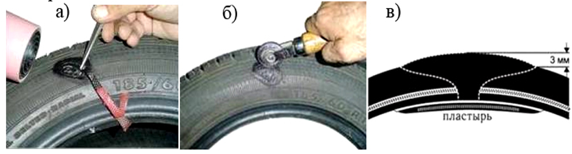 Современная технология позволяет производить быстрый и надежный ремонт всех основных видов повреждений радиальных и диагональных шин. Ремонту подлежат повреждения на беговой дорожке, боковине и плече шин. При этом используется метод горячей и холодной вулканизации. Метод холодной вулканизации позволяет в течение нескольких минут качественно отремонтировать камеру или шину.