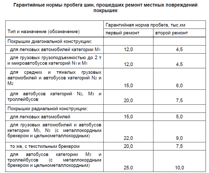 Завод-изготовитель безвозмездно ремонтирует покрышки, выбывшие из эксплуатации с пробегом менее 1/3 гарантийной нормы по причинам, связанным с плохим качеством ремонта. При пробеге более 1/3 завод выплачивает владельцу шин стоимость их недопробега до гарантийной нормы.