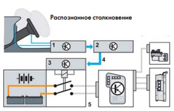 1 – блок управления подушек безопасности; 2 – диагностический интерфейс шин данных; 3 – блок управления батареи; 4 – сообщение CAN; 5 – высоковольтная система