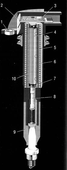 В блоке двигателя от детонации возникают волны вибрации. Под действием резонанса сила давления увеличивается, и вибрация возрастает. Сила вибрации воздействует на круглый пьезоэлектрический элемент, вырабатывающий электрический заряд. Напряжение, возникающее между верхней и нижней поверхностью керамического элемента датчика, снимается контактными шайбами 3 и затем обрабатывается блоком управления двигателем.