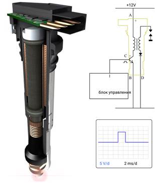 Выходной каскад В этой катушке выходной каскад является ее неотъемлемой частью. При включении зажигания напряжение аккумуляторной батареи подводится к положительному выводу первичной катушки. Выходной каскад внутри катушки зажигания обеспечивает проводимость для электрического тока, соединяя отрицательный вывод первичной обмотки с «массой» через блок управления. Это приводит к намагничиванию сердечника из мягкой стали. Если проводимость через транзистор не обеспечена, цепь первичной обмотки разомкнута, и напряжение на выходной клемме первичной обмотки равно напряжению аккумуляторной батареи. При включении проводимости, по виткам обмотки потечёт ток. Это значит, что напряжение на выходной клемме первичной обмотки станет равным нулю.