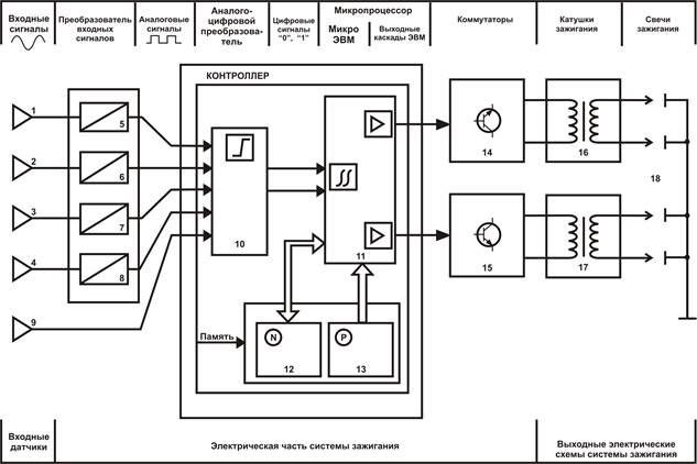 1….4 – входные датчики неэлектрических величин (датчик давления и температуры во впускном коллекторе, датчик детонации, датчик температуры двигателя, напряжение аккумуляторной батареи); 5…8 – преобразователи неэлектрических величин в аналоговые электрические сигналы; 9 – датчики крайнего положения дроссельной заслонки; 10 – аналогово-цифровой преобразователь; 11 – микропроцессор; 12 – оперативная память N память запоминающего устройства; 13 – постоянная память Р запоминающего устройства; 14,15 – коммутаторы; 16,17 – двухвыводные катушки зажигания; 18 – свечи зажигания.