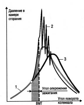 При нормальном процессе сгорания давление на поршень изменяется плавно (рис. 6.14, кривая 1). Пламя от искры распространяется плавно, постепенно захватывая весь объем камеры сгорания. Скорость движения фронта пламени достигает 50…80 м/с.