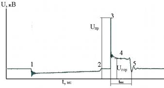 После накопления энергии в магнитном поле катушки зажигания (момент открытия силового транзистора коммутатора) перехода коммутатора в режим ограничения тока в первичной цепи происходит пробой искрового промежутка свечи (участок 3). Участок 4 отражает время (tиск) и характер горения электрической искры. Электрическое сопротивление среды и напряжение между электродами при этом резко падает до 1¼2 кВ (Uгор). Длительность этого участка характеризует энергию искры, существенно влияющую на качество воспламенения рабочей смеси. Через 0,7¼1,5 мс после окончания процесса горения смеси вблизи электродов становится все меньше ионизированных частиц, поэтому сопротивление среды возрастает и напряжение между электродами свечи немного увеличивается. При этом энергии напряжения для поддержания искры недостаточно, в результате чего искра затухает. При исчезновении тока вторичного напряжения остаточная энергия вызывает затухающие колебания на участке 5.