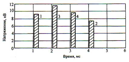 При проверке системы зажигания с помощью осциллоскопа можно определить максимальное напряжение, возникающее на каждом из электродов свечи отдельных цилиндров (рис. 6.20) согласно порядку их работы. Уменьшение зазора между электродами свечи (второй цилиндр) или увеличение (третий цилиндр) соответствует уменьшению или увеличению амплитуды импульса. Уменьшение амплитуды импульса, а значит, и энергии искры ниже 7 кВ приводит к снижению мощностных и экономических характеристик двигателя. Увеличение энергии искры сверх 11 кВ, несмотря на некоторое улучшение экономических показателей работы двигателя, может привести к пробою диэлектрических деталей системы зажигания и утечке тока.