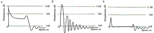 Если напряжения пробоя и горения искры выше нормы, а длительность горения искры больше 1,5 мс (рис. 6.21, а), основными причинами являются неисправности свечи зажигания, катушки зажигания, заливание свечи топливом или маслом. При отсутствии участка горения (рис. 6.21, б) и амплитуде напряжения пробоя выше нормы идет высоковольтный колебательный процесс (как зеркало повторяющий колебания в первичной обмотке катушки зажигания), что означает, обрыв провода, идущего к свече проверяемого цилиндра. Если процесс горения наблюдается, но напряжение значительно ниже нормы, а время горения больше 2,5¼3,0 мс, значит, закорочен высоковольтный провод (рис. 6.21, в).