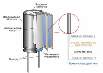 Отдельную группу составляют изделия, у которых одна обкладка выполнена из металла, а в качестве второй выступает электролит. Это класс электролитических конденсаторов (пример на рисунке 3 ниже). Они отличаются от других типов изделий большой удельной ёмкостью. Похожими свойствами обладают оксидно-полупроводниковые модели. Второй анод у них – это слой полупроводника, нанесённый на изолирующий оксидный слой.