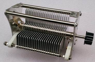 Существуют различные типы конденсаторов. Большинство конденсаторов имеют фиксированную емкость, за исключением переменного конденсатора. Переменный конденсатор (рис. 1.10) — конденсатор, электрическая ёмкость которого может изменяться механическим способом, либо электрически.