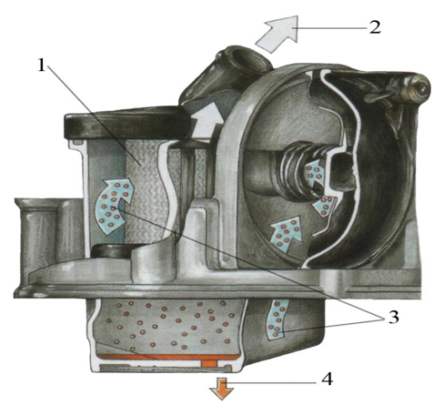 1 – синтетический фильтроэлемент; 2 – картерные газы, очищенные от масла; 3 – картерные газы, содержащие частицы масла; 4 – отделенное масло