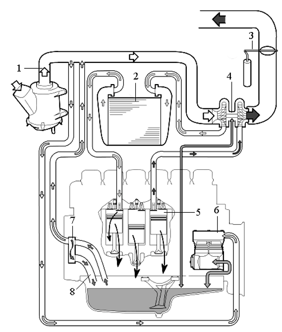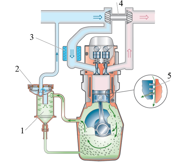 1 – циклонный маслоотделитель; 2 – клапан регулировки давления; 3 – охладитель нагнетаемого воздуха; 4 – турбокомпрессор; 5 – газы, прорывающиеся через поршневые кольца