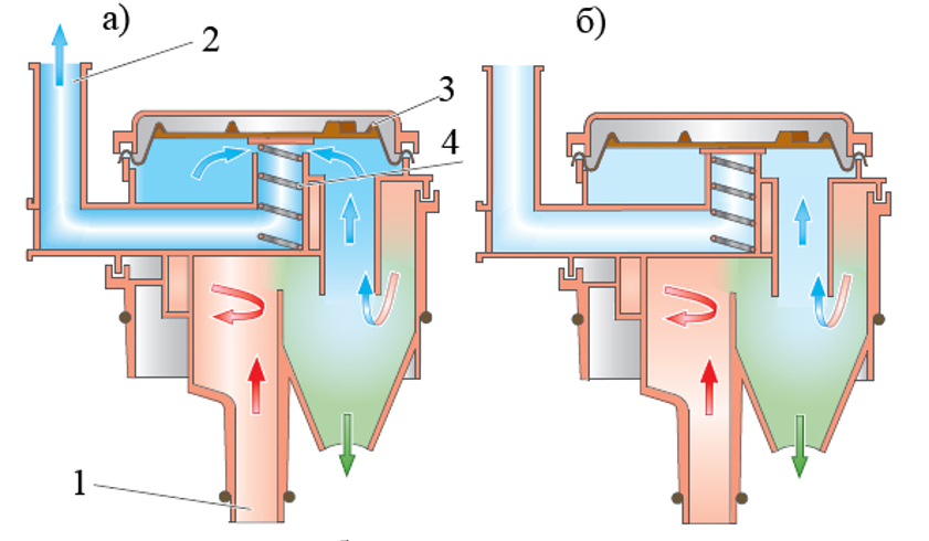 1 – трубопровод подачи картерных газов; 2 – трубопровод забора воздуха; 3 – мембрана; 4 – пружина сжатия; а – открытое положение клапана; б – закрытое положение клапана