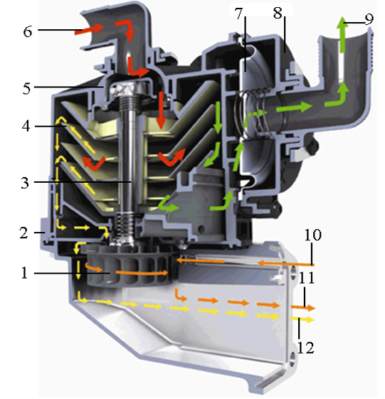 1 – турбина; 2 – корпус; 3 – ось; 4 – пластины; 5 – колпак; 6 – картерные газы до обработки; 7 – диафрагма; 8 – диафрагменный клапан; 9 – картерные газы после обработки; 10 – поступление частиц масляного тумана картера; 11 – возврат частиц масляного тумана картера; 12 – отделенное масло