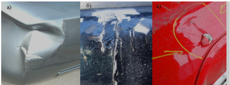 а – несквозной дефект вмятина; б – несквозной дефект царапины, риски, отслоения краски; в – сквозной дефект пролом